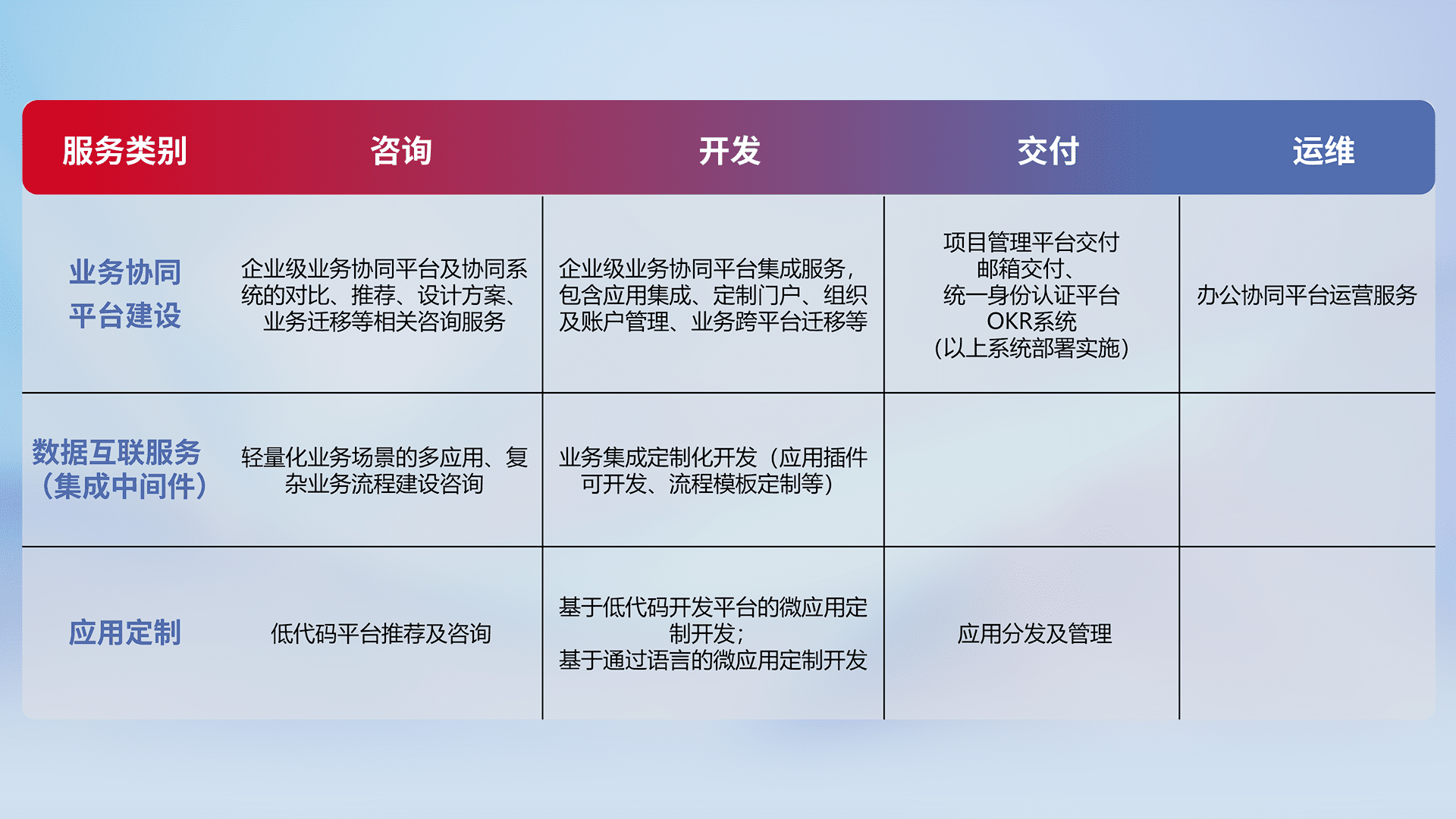 针对钉钉、、企微、、、、IDaas等平台级产品提供产品的规划、、、方案、、交付、、、、定制化开发等服务,,,,实现如统一协同办公、、、智能客户服务、、、、混合会议管理、、智能数据查询、、等业务场景,,,,实现数字化转型。。。。